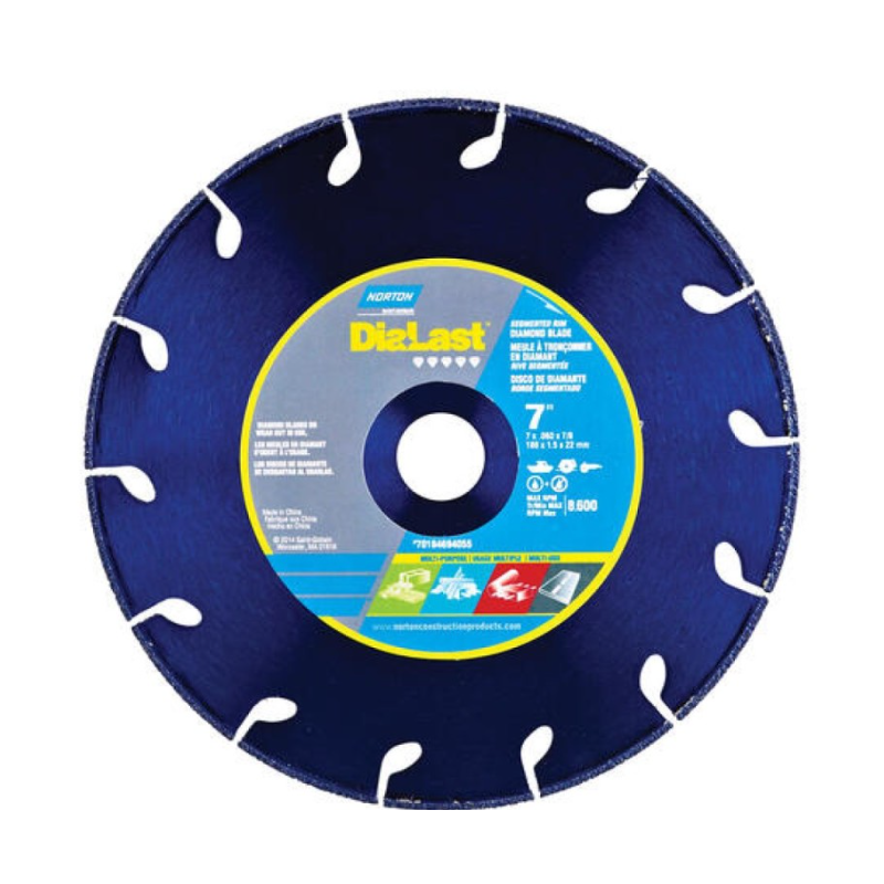 Disco de centro hundido Norton DiaLast, corte recto a la derecha reforzado, diámetro de disco de 7", espesor de disco de 0,06", orificio central de 7/8", abrasivo de diamante, velocidad máxima de 8600 rpm, aglomerante de una sola capa, materiales aplicables: placa metálica, tubos, tuberías, hierro fundido, acero al carbono, acero dulce, materiales cerámicos y de fundición, número de tipo de disco: tipo 1/41